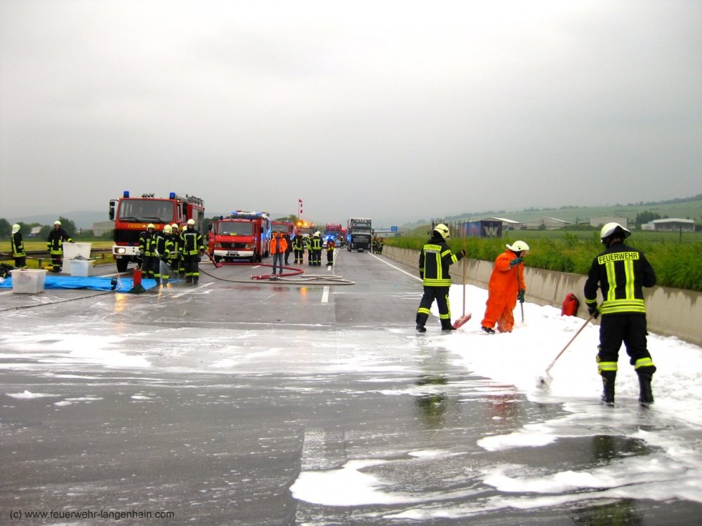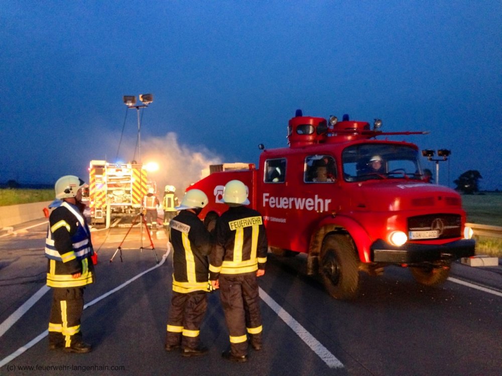 Bereits gegen halb 4 alarmierte die Rettungsleitstelle die Kameraden der Stützpunktwache zu einem brennenden Lkw auf die Autobahn 4, bei dem später Gefahrstoffe als Ladung festgestellt wurden.